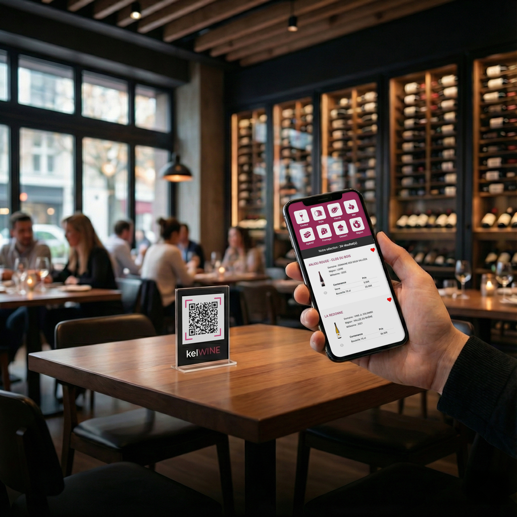 Accessible via tablette ou QR code, kelWINE permet à vos clients :